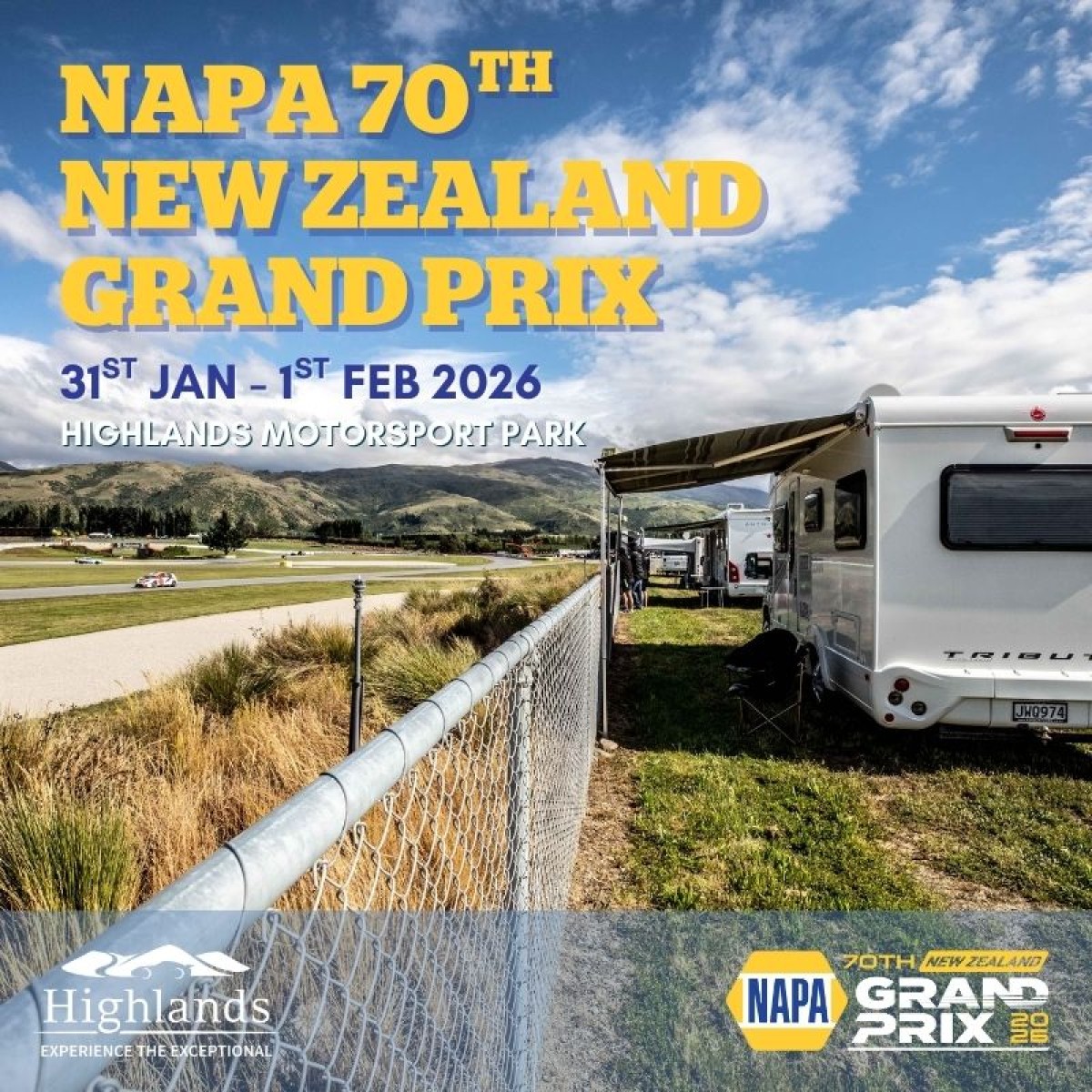 Highlands are thrilled to offer Self Contained Motorhome/Caravan sites for the upcoming NAPA 70th New Zealand Grand Prix.