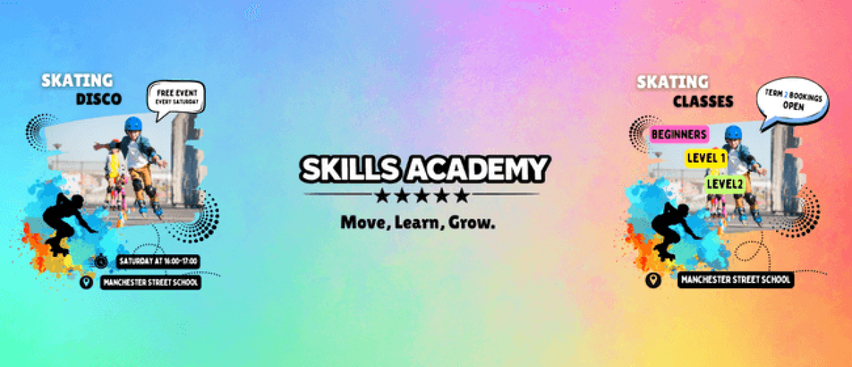 Join us for a free community Skating Disco every Saturday from 4:00–5:00 PM, hosted by Skills Academy.