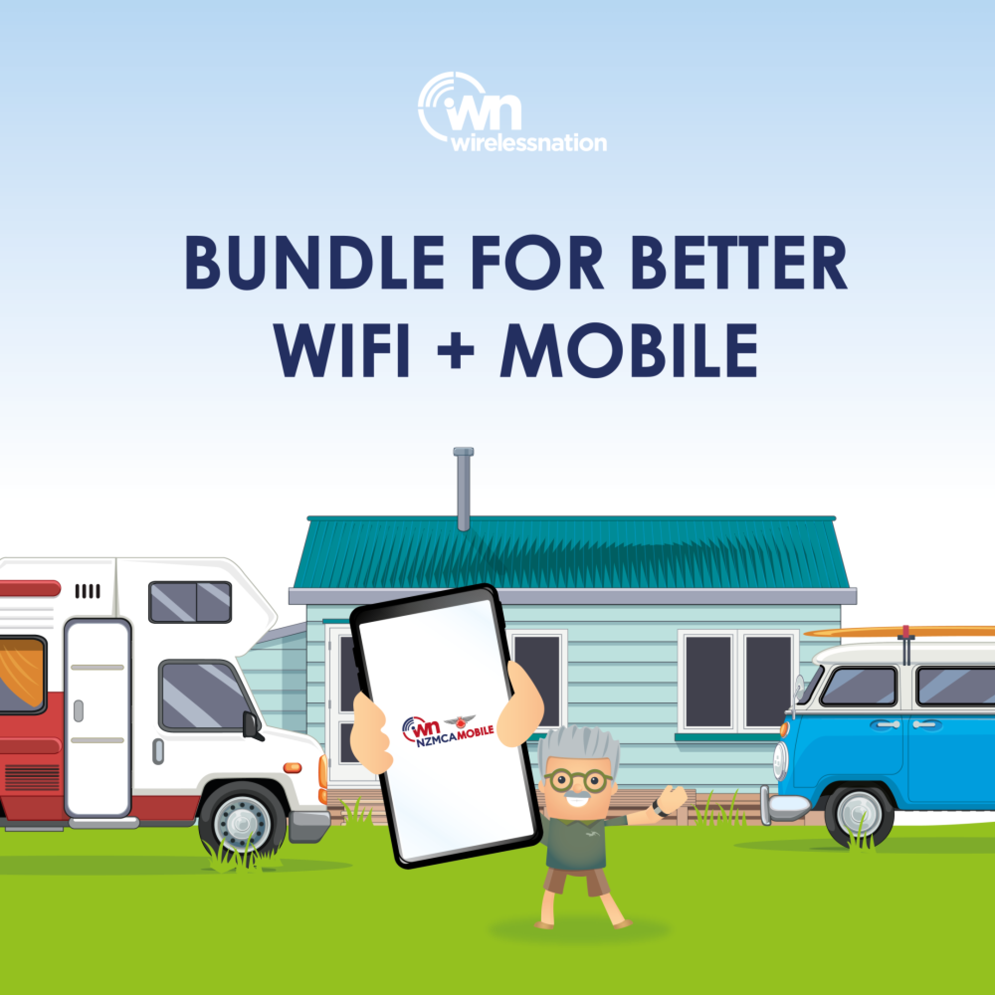 We call it NZMCA Data and it's wireless internet you can take with you. Using a broadband modem with a data plan of your choice, simply plug in the modem to power (240 or 12-24V), and connect your devices to the internet. You can use it almost anywhere in New Zealand - your caravan, motorhome, bach, house and even on a boat!
