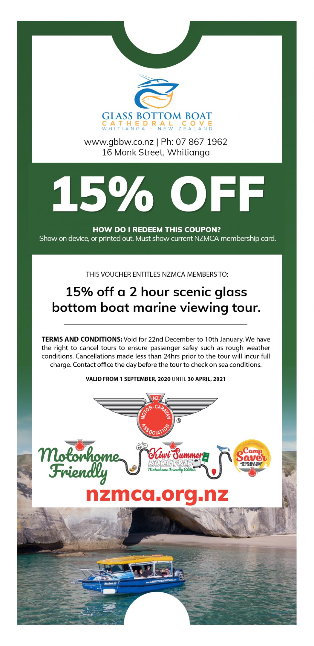 It is near some popular Coromandel tourist spots including Hahei, Cathedral Cove, and Hot Water Beach. With the world-renowned Coromandel Coast and the Cathedral Cove (Te Whanganui-A-Hei) Marine Reserve on its doorstep, you will find many charter boats plying the waters of Mercury Bay for fishing, diving or scenic cruising trips. The Whitianga Marina is a world class New Zealand 'Clean Marina' and a popular stop-off point for both local and international boat owners visiting the Coromandel Peninsula.