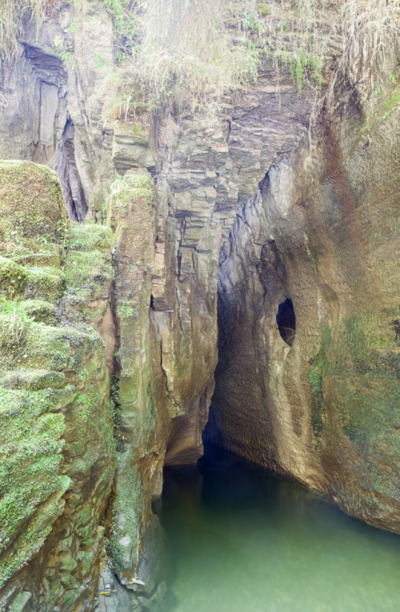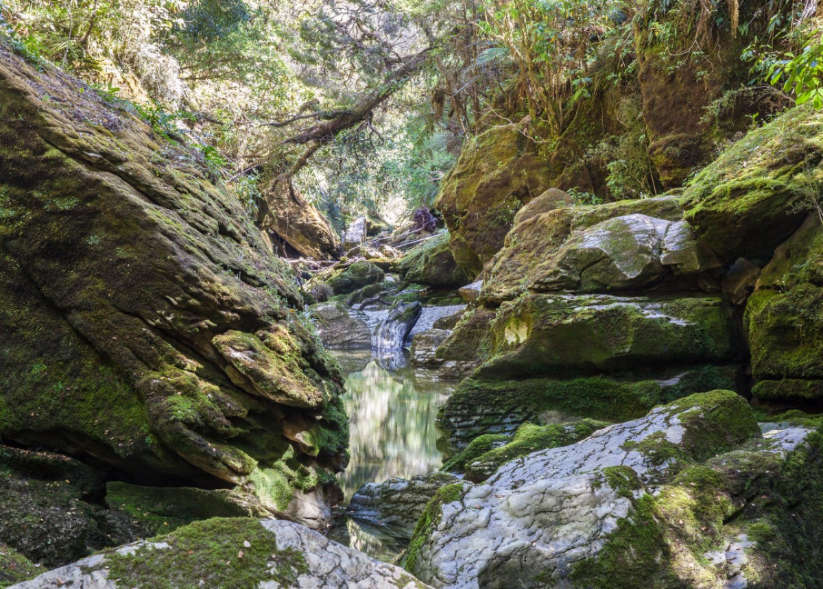 From the carpark, follow the track markers to the T-intersection. Turn right as indicated by the track sign and continue for 300 m until the stone memorial is reached. Turn left and continue to a signpost indicating the track to Cave Creek/Kotihotiho. After crossing a ridge, the track descends into a deeply incised gorge. The creek-bed where the track ends is usually bouldery and dry. In normal conditions, the stream emerges from underneath rocks in several places near here.