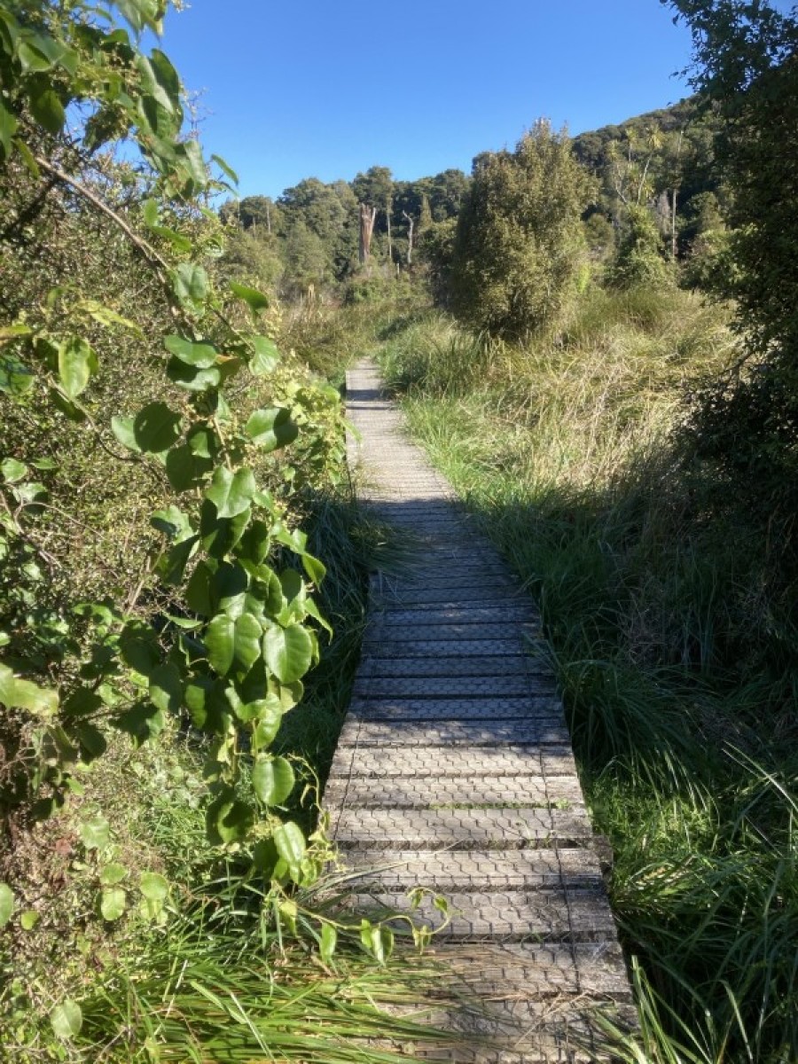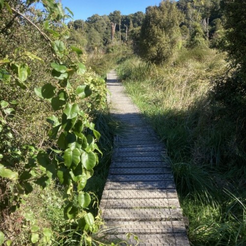 The easy stroll across the boardwalk brings you into contact with some uncommon and interesting native flora, including swamp Maire and small-leafed Hoheria. Brown mudfish and banded kokopu may be hiding beneath the vegetation, and you might even be treated to the unusual spectacle of a duck (grey teal) in a tree.