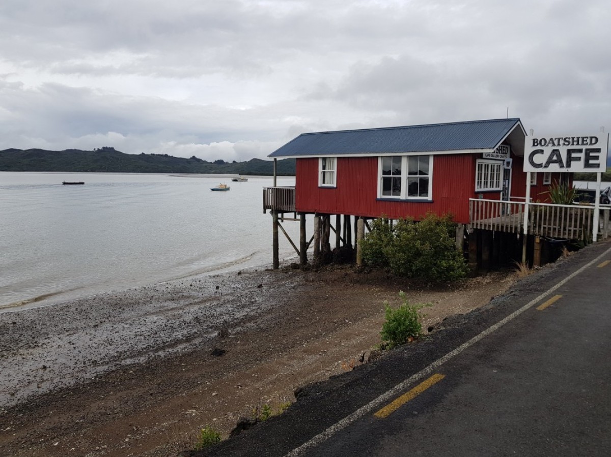 Just after crossing the Waipoua River bridge, it is possible to detour 1km to the right to Café Forest, which is part of a visitor complex with information, camping and cabin options.