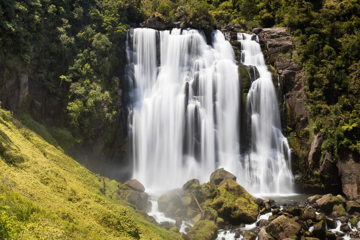 The 35 m high falls are often described as the most beautiful in the country. Here the Marokopa River cascades over the undercut greywacke basement rock.