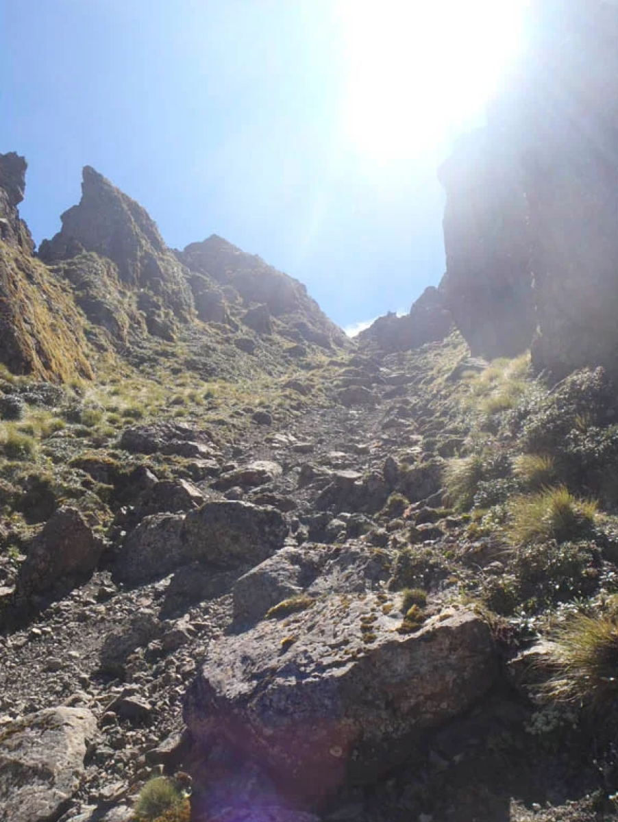 The last 400 m is a scree slope. It's steep with unstable footing. Watch your footing to avoid causing rockfall and injury – extreme care is required. Do not attempt in conditions that are wet, windy, icy, or visibility is poor.