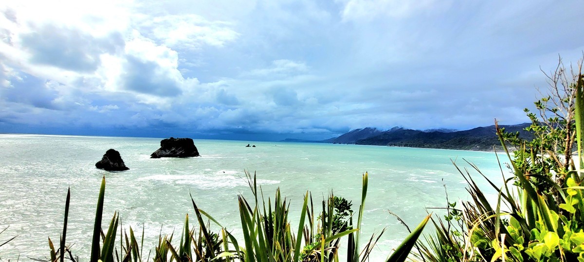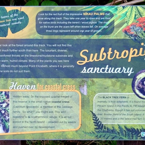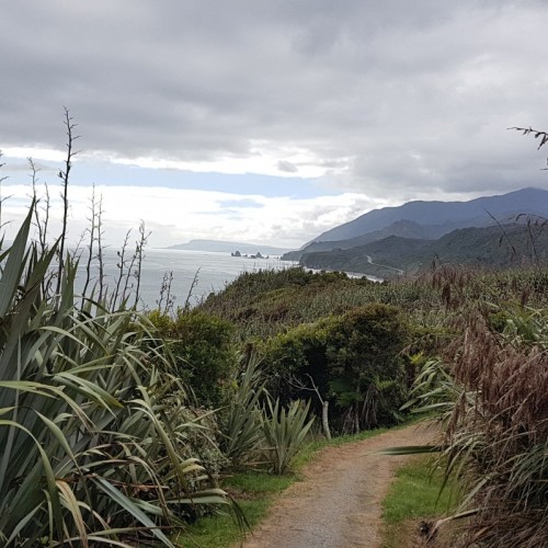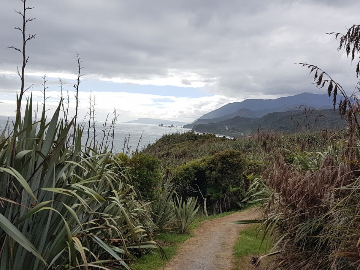 Gradually the sea can be heard again as big forest gives way to more stunted growth and waves of flax on the Point Elizabeth headland. The exposed rocky point lookout has views south toward Mt Cook, north along a spectacular rocky coast and inland towards the Paparoa Mountain Range.