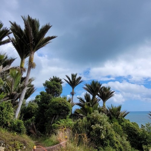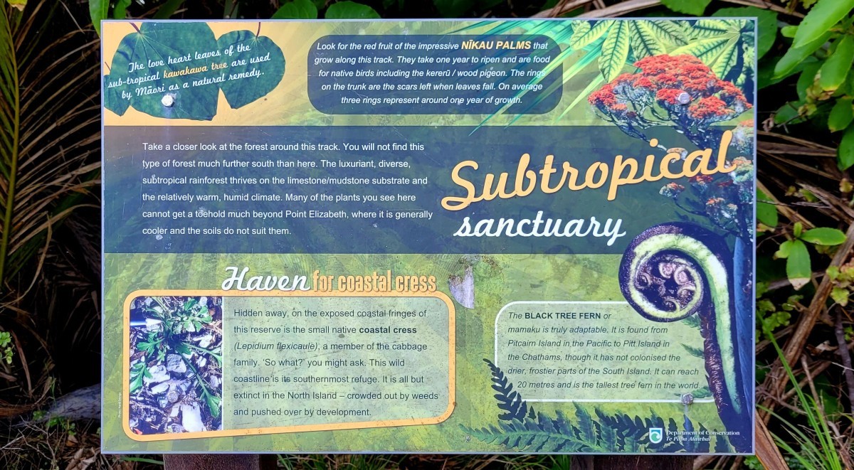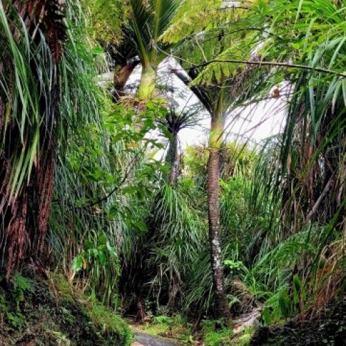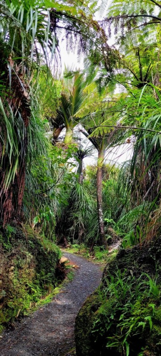 The stunning subtropical forest features nikau palms and mamaku (black tree fern) intertwined with supplejack vines and kiekie. There are also large podocarps like rimu, kahikatea, and miro along with epiphytic northern rata adding a splash of crimson during summer.
