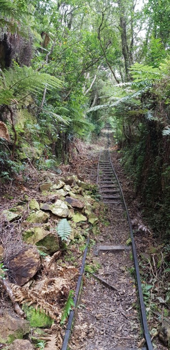 After about an hour the loop turns back south at the signposted junction and joins the Piako County Tramway at the base of Butlers Incline, with the rail still in place giving a sense of how the tramway worked. The walk then descends along the tramway to the top of the Fern Spur Incline giving views to the south. It is a short walk down the hill from here to the car park.