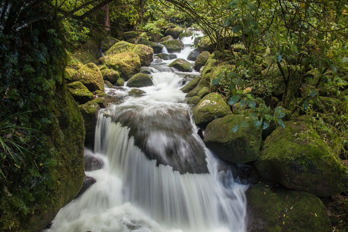 Wairere Falls Track weaves its way through moss covered rocks and tree roots. Large round boulders form natural pools and cascading waterfalls.