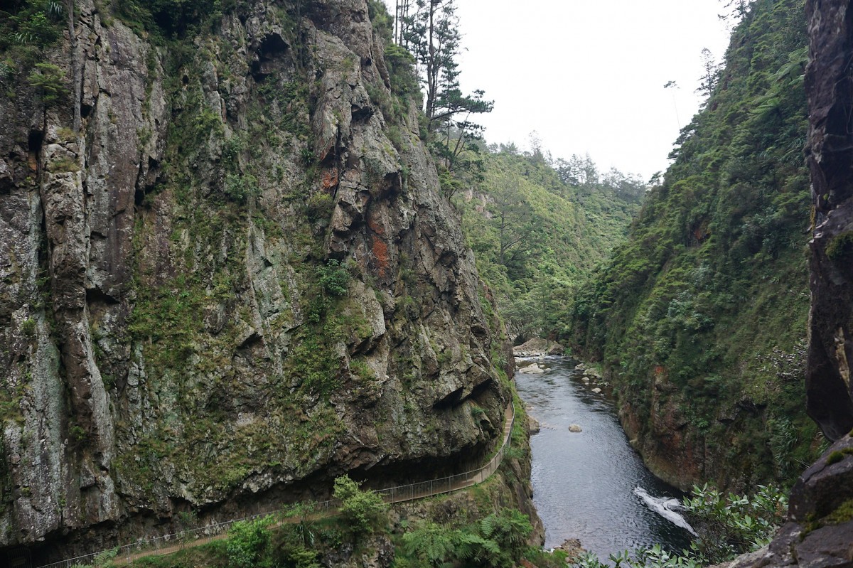 Alternatively, continue south along the tramline through the spectacular Waitawheta Gorge. The main track requires one river crossing but there is a bypass track that requires just a few small side stream crossings. The main track then leaves the river and through a campsite before reaching the toilet bowl waterfall, the Waitawheta Hut, and the site of the old logging mill. Return via the same track, or spend the night to explore more of the park.